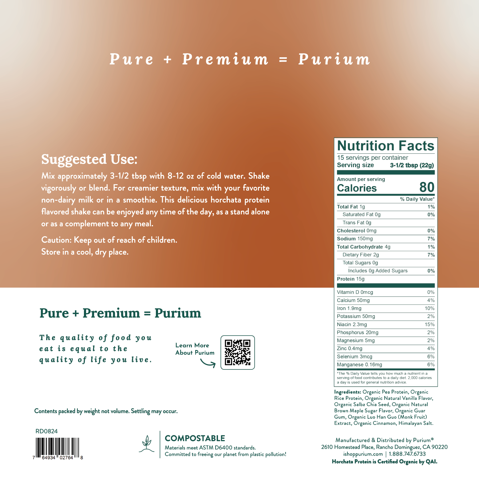 Suggested Use: Mix approximately 3-1/2 tbsp with 8-12 oz of cold water. Shake vigorously or blend. For creamier texture, mix with your favorite non-dairy milk or in a smoothie. This delicious horchata protein flavored shake can be enjoyed any time of the day, as a stand alone or as a complement to any meal.