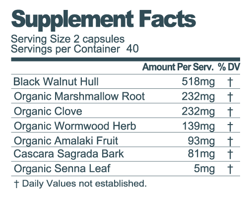 Ingredients: Black Walnut Hull, Marshmallow Root, Clove, Wormwood, Amalaki, Cascara Sagrada Bark, Senna Leaf.